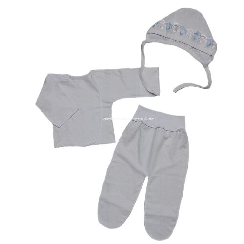 Комплект выполнен из 100% хлопка и состоит из: распашонки с рукавчиками-трансформерами, с кнопочками спереди на плечиках, ползунков на широкой резинке, чепчика с шитьём. Все швы у набора выполнены наружу.