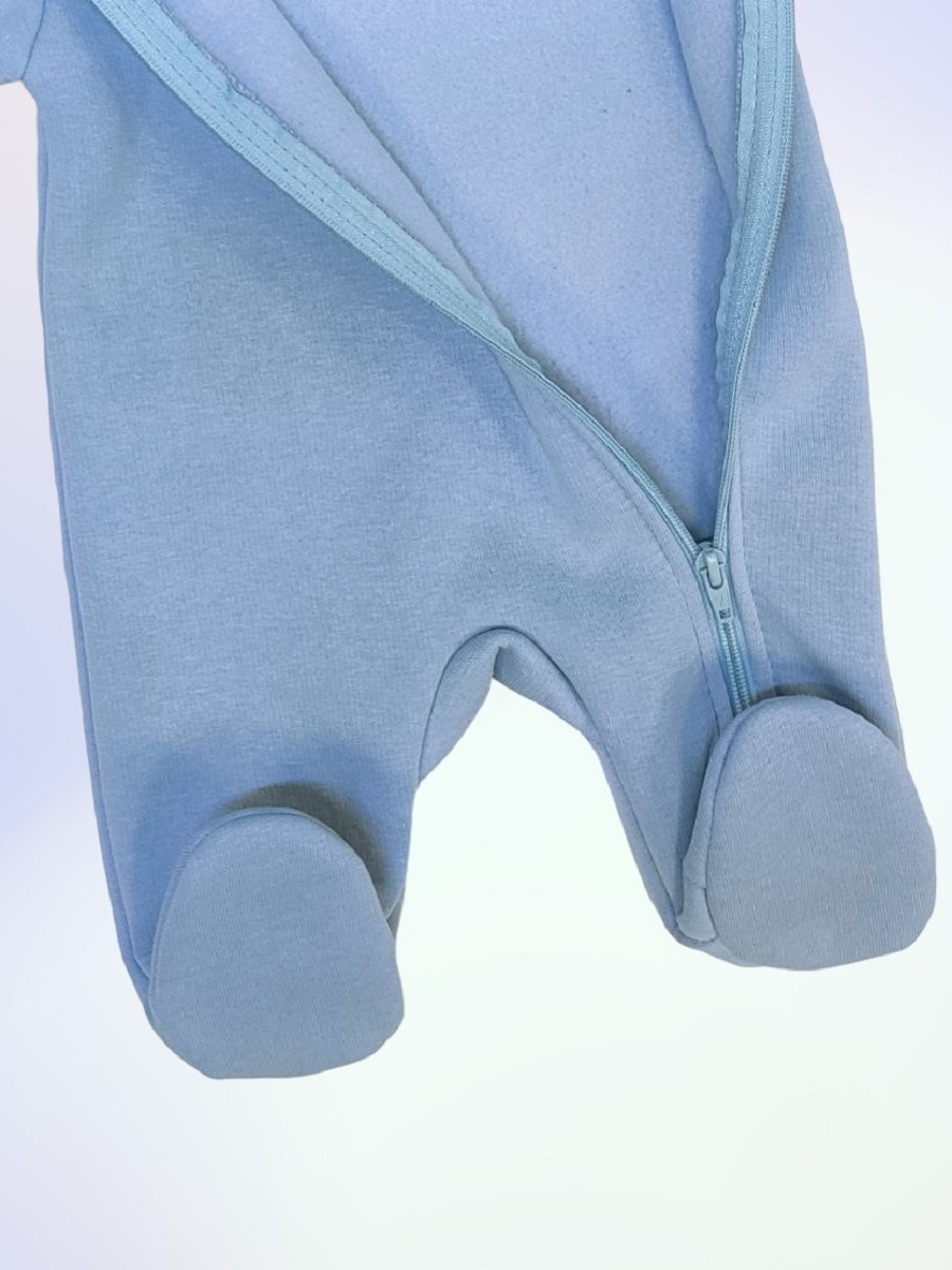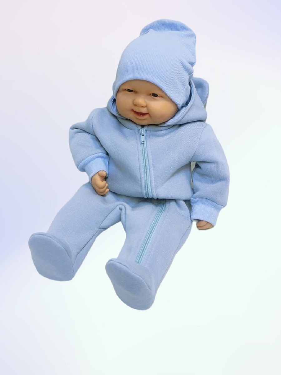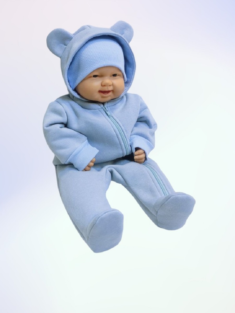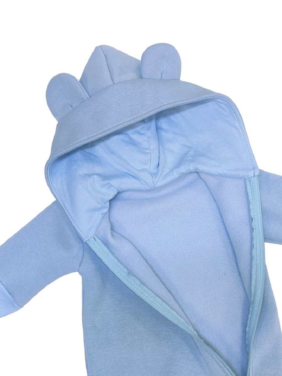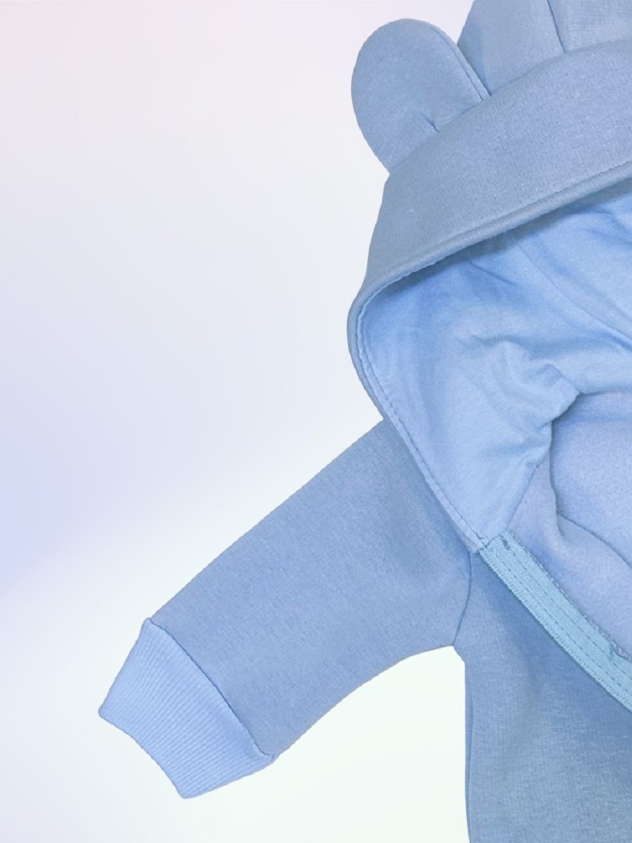 Комбинезон выполнен из футера двухнитки с начёсом. Спереди косая молния, капюшон на подкладке. У комбинезона закрытые ножки, на рукавах манжеты.